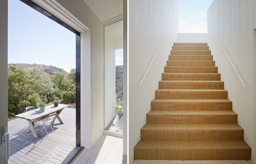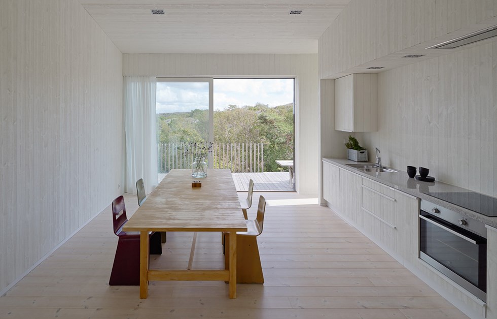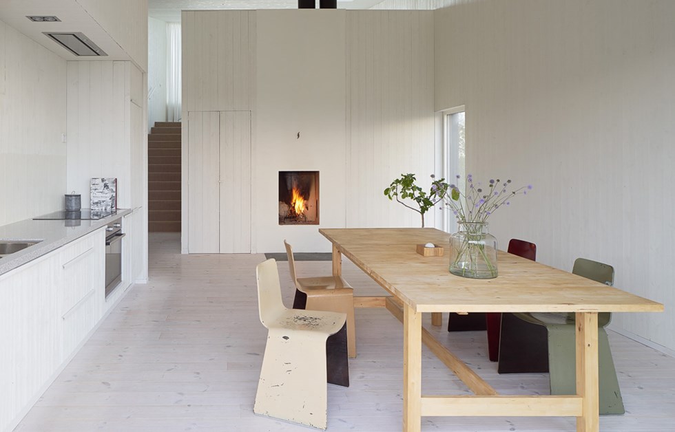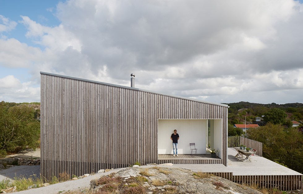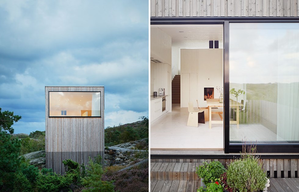Two buildings form an elegant pair in carefully considered locations. The main building enjoys views across the sound. The smaller building provides screening from the neighbours. The cross-section of the main building was informed by the terrain and the client’s brief. The interior layout is almost primitive in its design, with a focus on gathering around the fire and the views. The chimney breast stands in the centre of the building, providing two fireplaces, one on top of the other. The windows look out entirely onto pristine nature and public spaces. The entrance stands out as the only opening in the façade, making it clearly identifiable from the road, which is quite a way away. Norwegian Wenche Selmer’s simple little holiday homes are a key reference, as reflected in the small scale and the consistent use of wood.