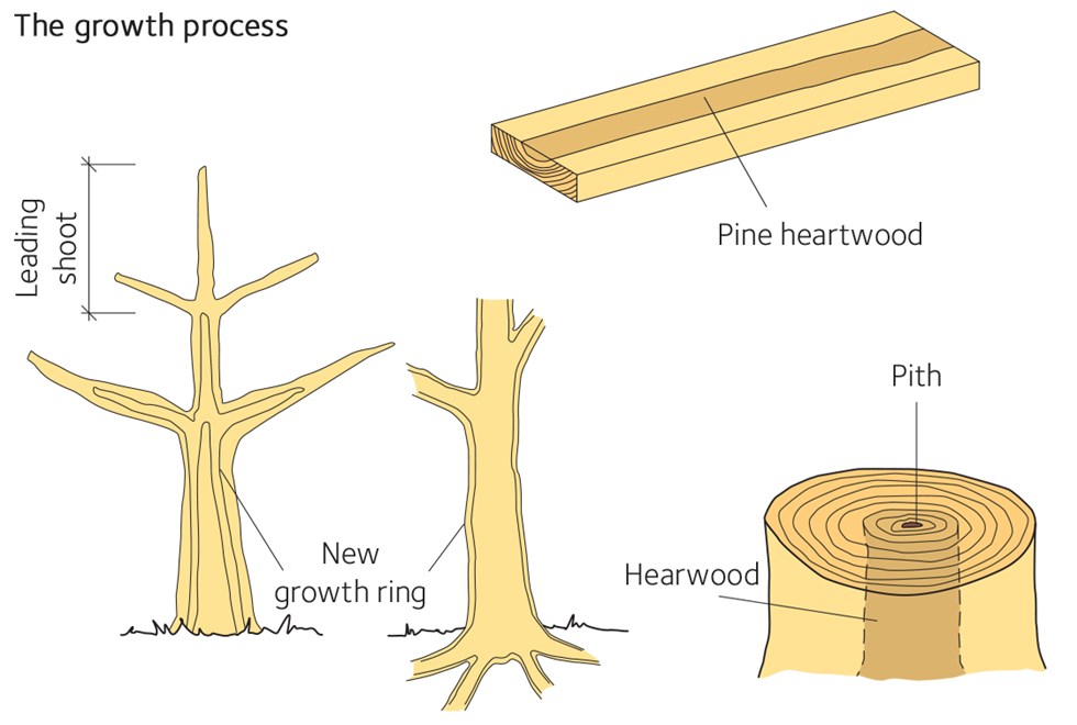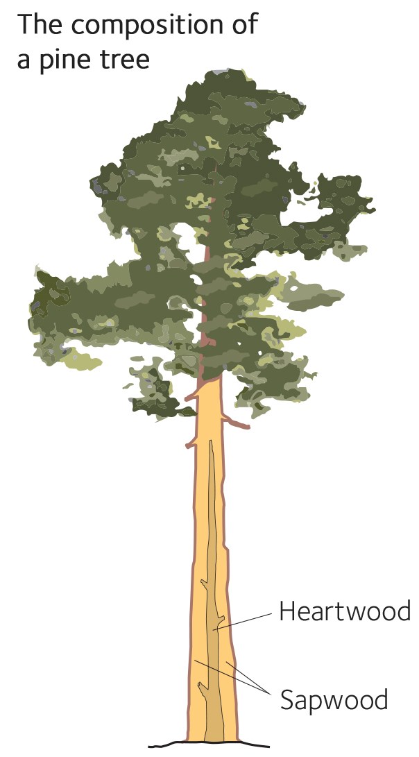 Pines and spruces have a similar composition. In the centre of the stem’s cross-section sits the pith, which runs through the whole tree and terminates at the top with a bud. The pith is enclosed by the wood, which can be divided into the heartwood and the sapwood, which is closest to the bark. The cells in the heartwood are dead and some have been clogged up with resin, which means that they can’t carry water and thus have a relatively low moisture content, 30–50%. The sapwood’s cells are also dead, except for about 5–10 percent, which are the nutrient-carrying parenchyma cells.