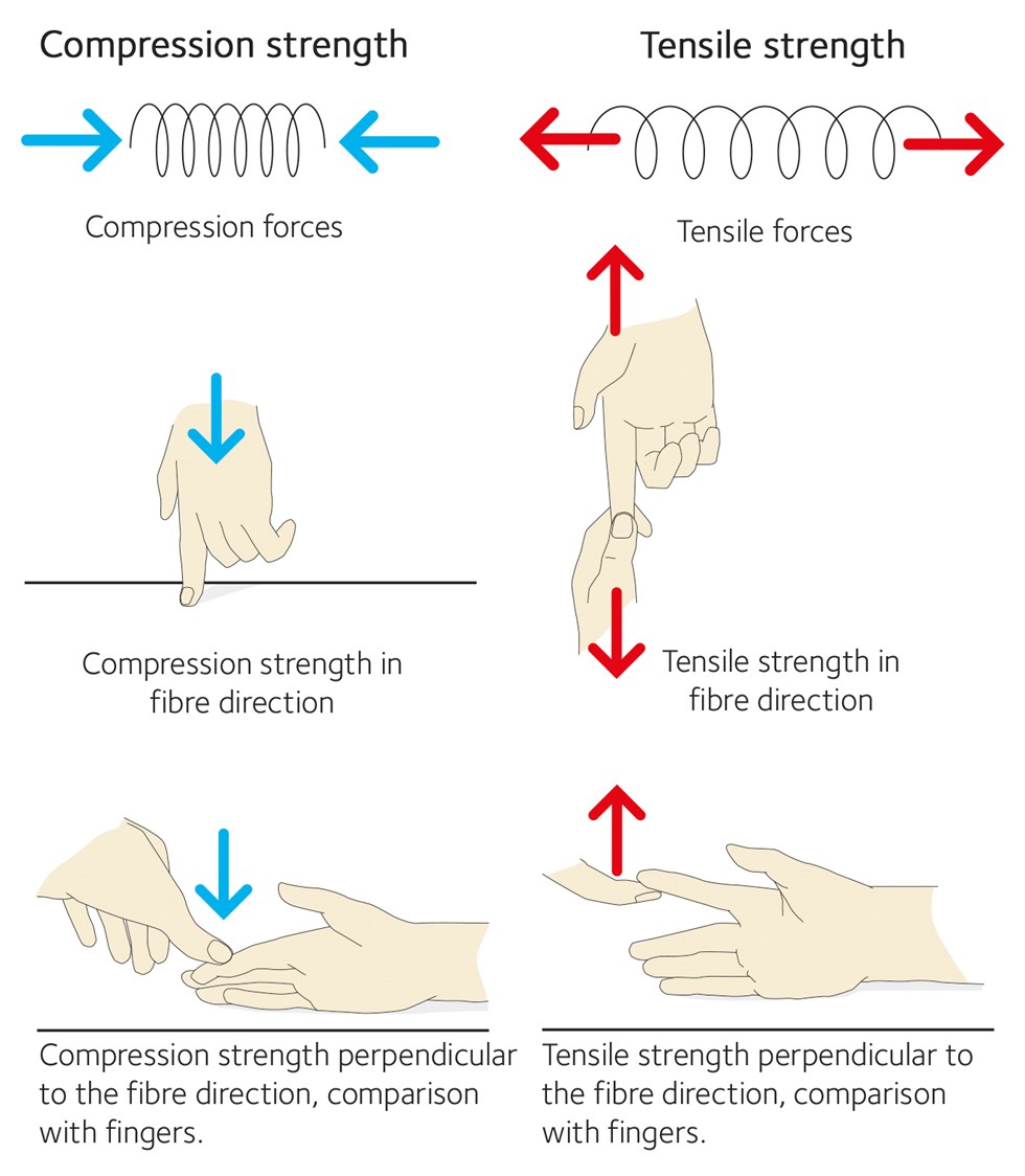 - Compression strength is high in the fibre direction, with the grain, but much lower, around 1/6, across the grain.