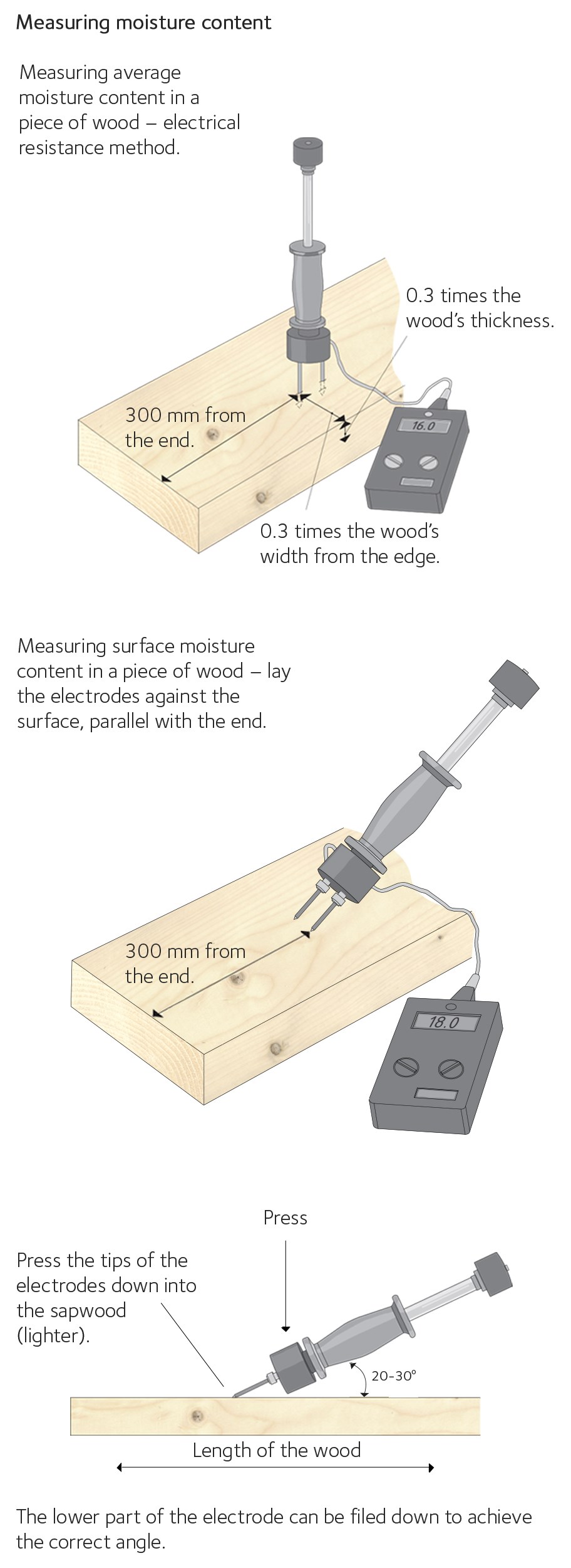 To reduce the effect of the way the meter is used, standard SS-EN 13183-2 sets out how the insulated hammer electrodes should be inserted into the piece of wood. The average moisture content of wood is measured as follows: measure 300 mm from the end. Insert the insulated hammer electrodes into the face of the wood, in the direction of the grain, and along an imaginary line running 0.3 times the width of the wood in from the edge. The measurement depth should be 0.3 times the thickness of the wood, see fig. 50.