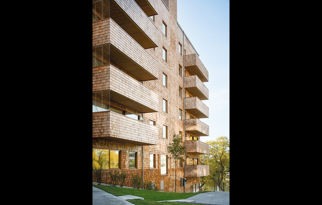Strandparken’s location on the sunny side of Bällstaviken marked the starting point for the design. Contact with the water, sightlines, the sun, the surrounding area and the mature trees helped to determine the position of the buildings. The steeply pitched roofs of the apartment blocks have discrete eaves. The material count is low and the attention to detail is high. The structural frame is solid wood, with wooden façades that give the buildings a time-honoured and characterful appearance. Balconies with glass ends overlooking the water provide both views and privacy. Large areas of glass, with sliding doors onto the balcony or roof terrace, extend the apartments and give them a sunny outdoor space that offers contact with the water.
