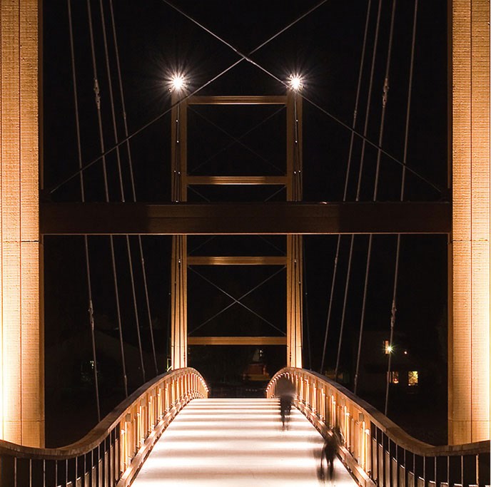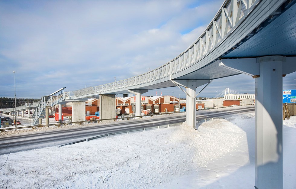 When this 230 m pedestrian/cycle bridge was being erected in Umeå, train traffic was able to continue as normal, despite the bridge traversing the track. It was possible to install the part of the bridge that crosses the track in 45 minutes, i.e. between two trains.