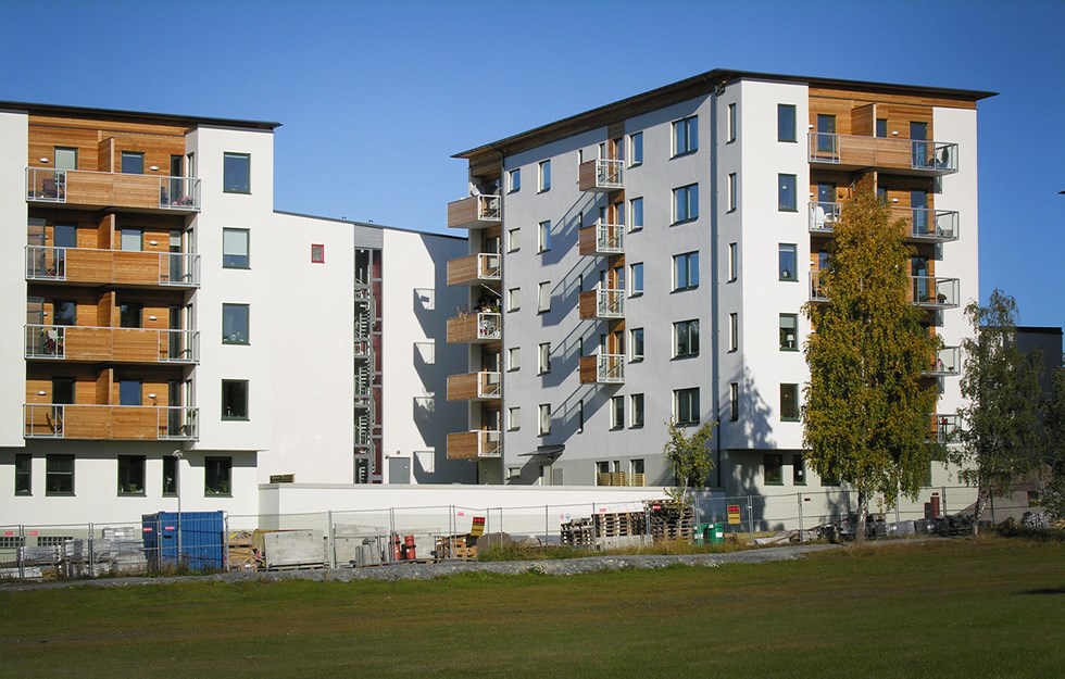 It doesn't show from the outside, but this six-storey block in Råcksta in Vällingby from 2009 was built using timber volumetric units.