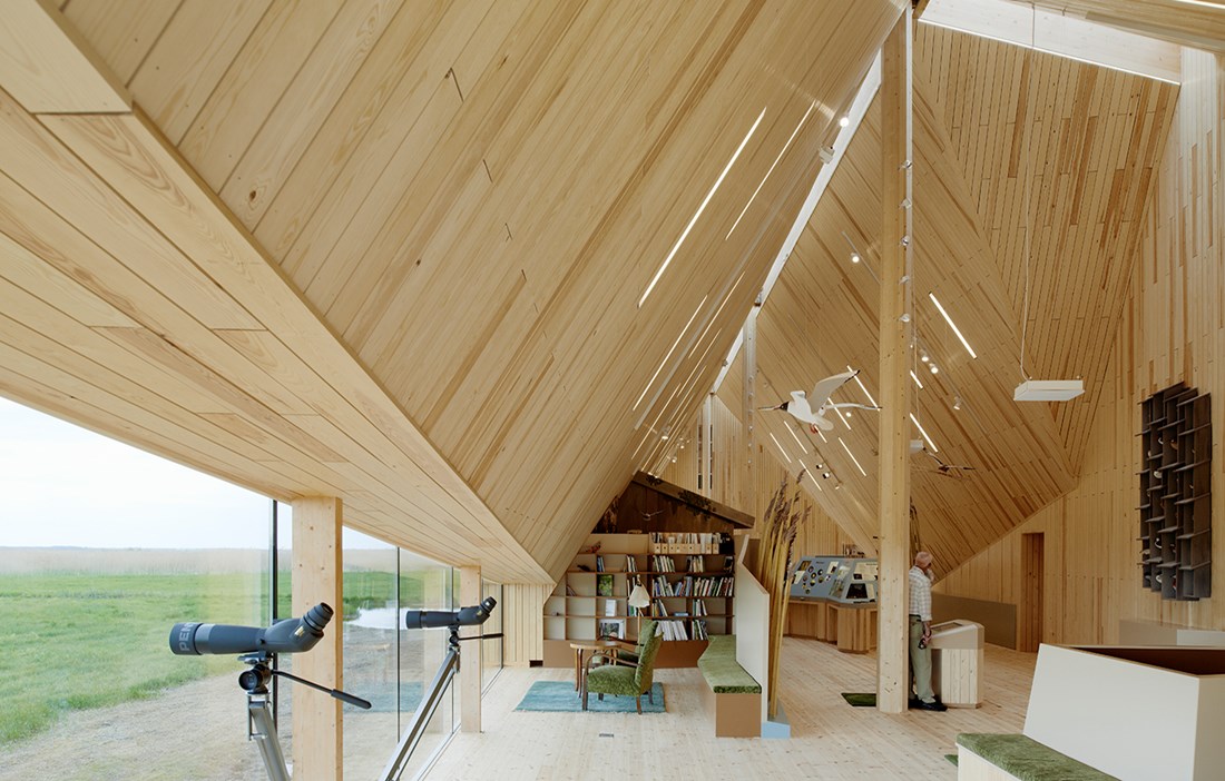 The visitor center Tåkern is shaped like a cut from a reed. Inside there is a large space, facing the view of the birds on the lake and the sky. The folds imitate the movement of the landscape. The design is shaped by the fastidious need of openings. Visitor Center Tåkern was nominated for the Swedish Wood Award in 2016.