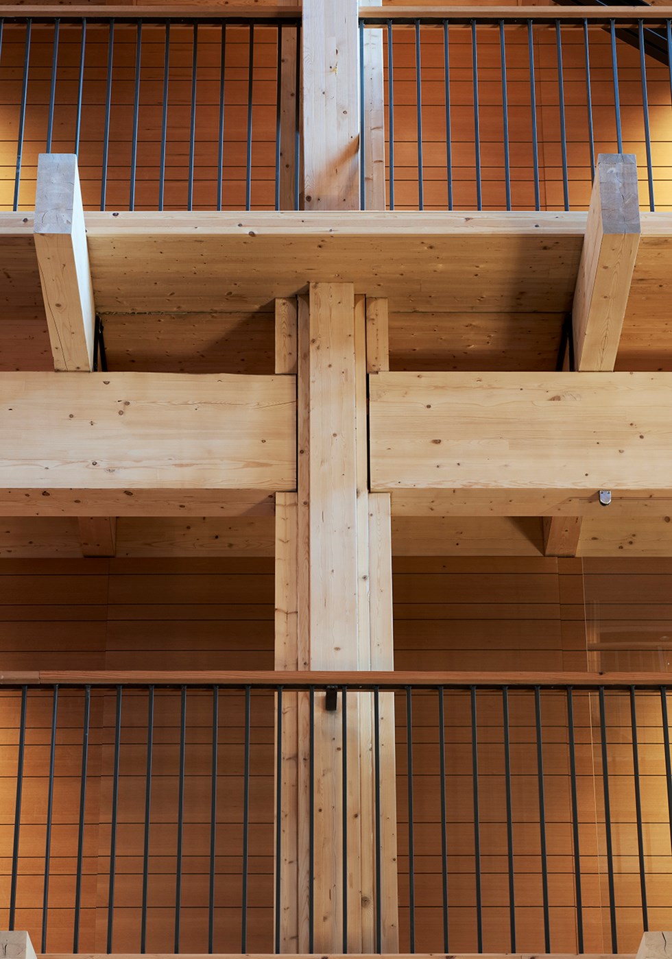 Exposed glulam structure made of spruce, massive wood floor boards, walls and ceilings clad in Oregon pine.