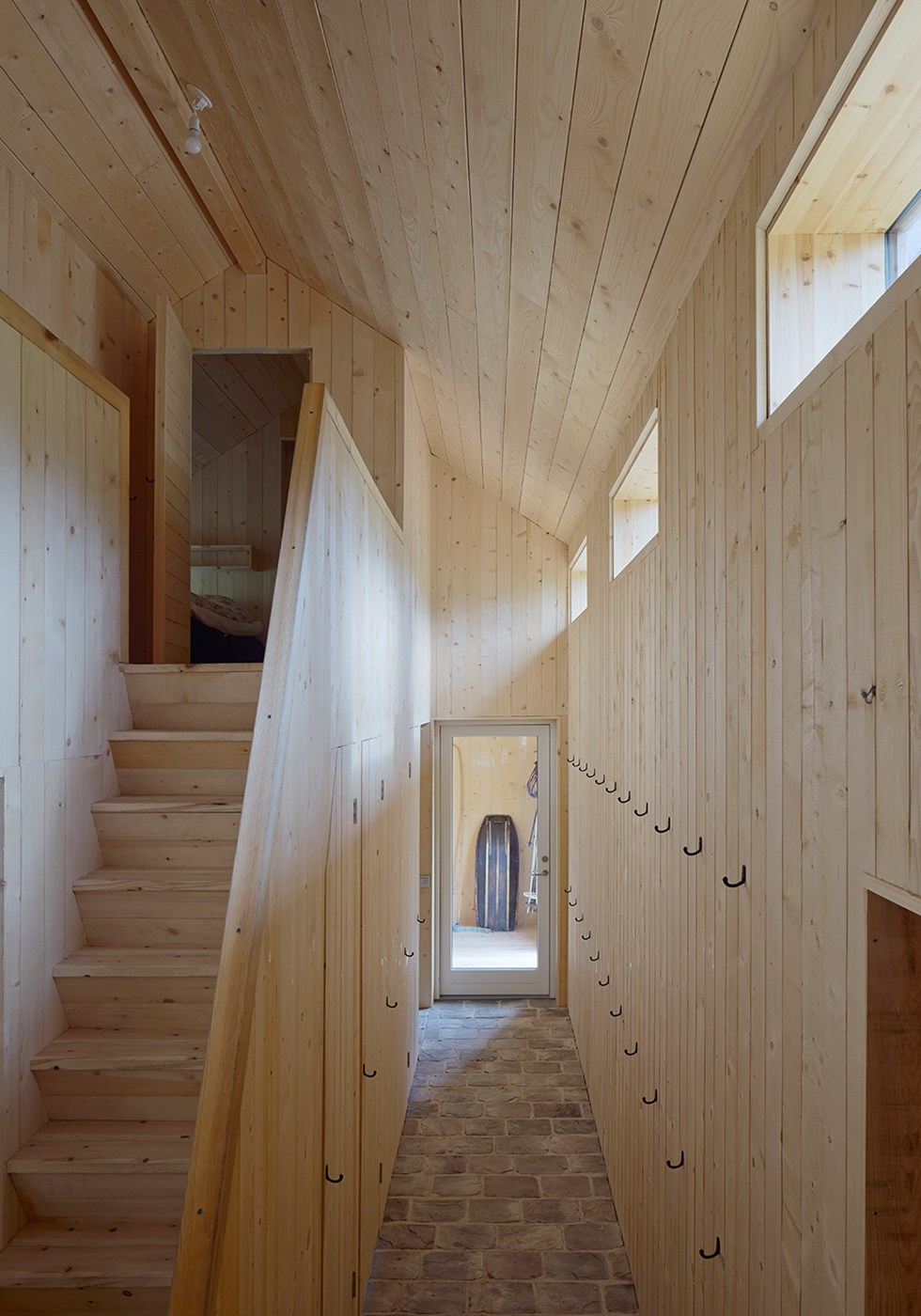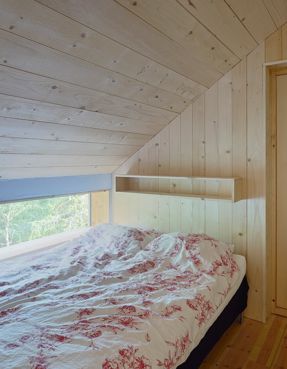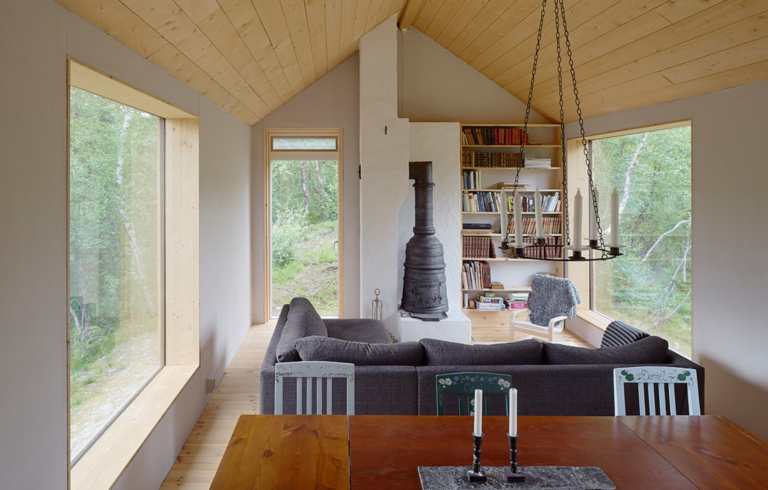 Fine-sawn vertical spruce paneling, edge-glued spruce boards for window frames. Frame and walls in Isotimber and glulam. Exterior cladding in heartpine.