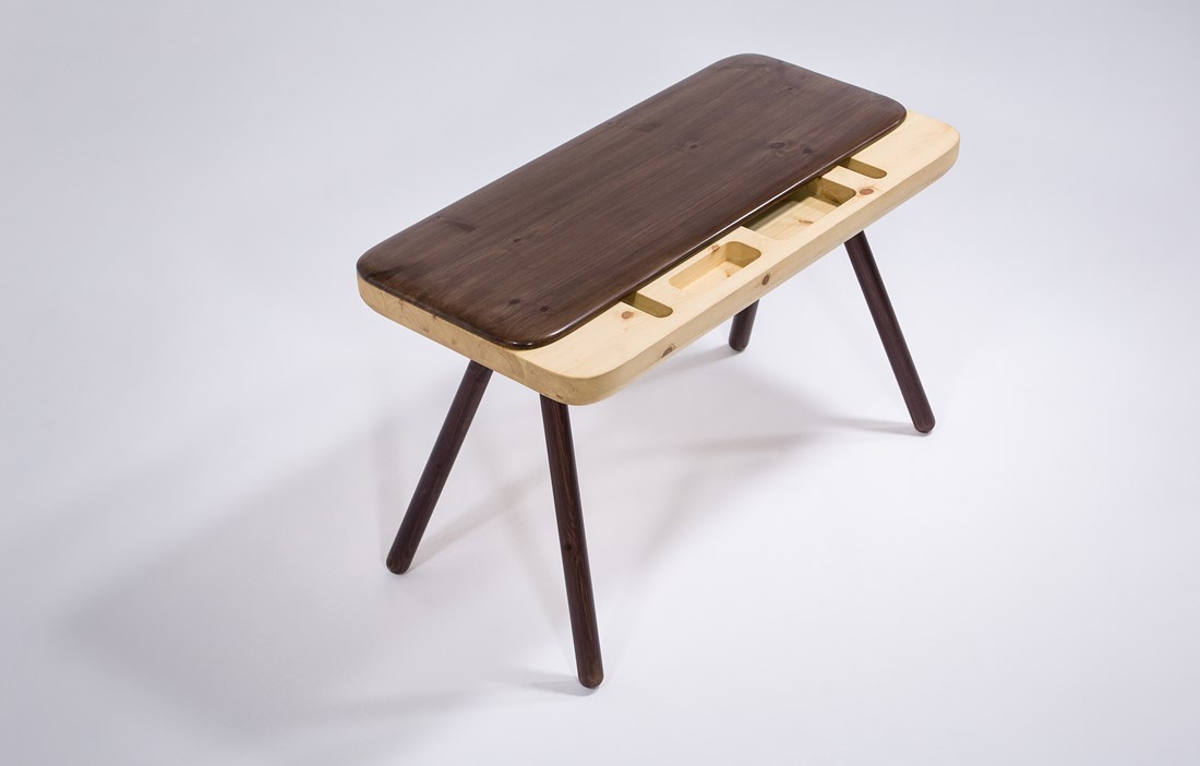 During the trip in Sweden, Wu Wei was fascinated by the lakes in the forest. When he designed the table using Swedish pine, he dug some “lakes” on the table top for the storage of paper, pens, books, iPad and even a socket instead of making drawers. A sliding cover and the legs are stained brown.