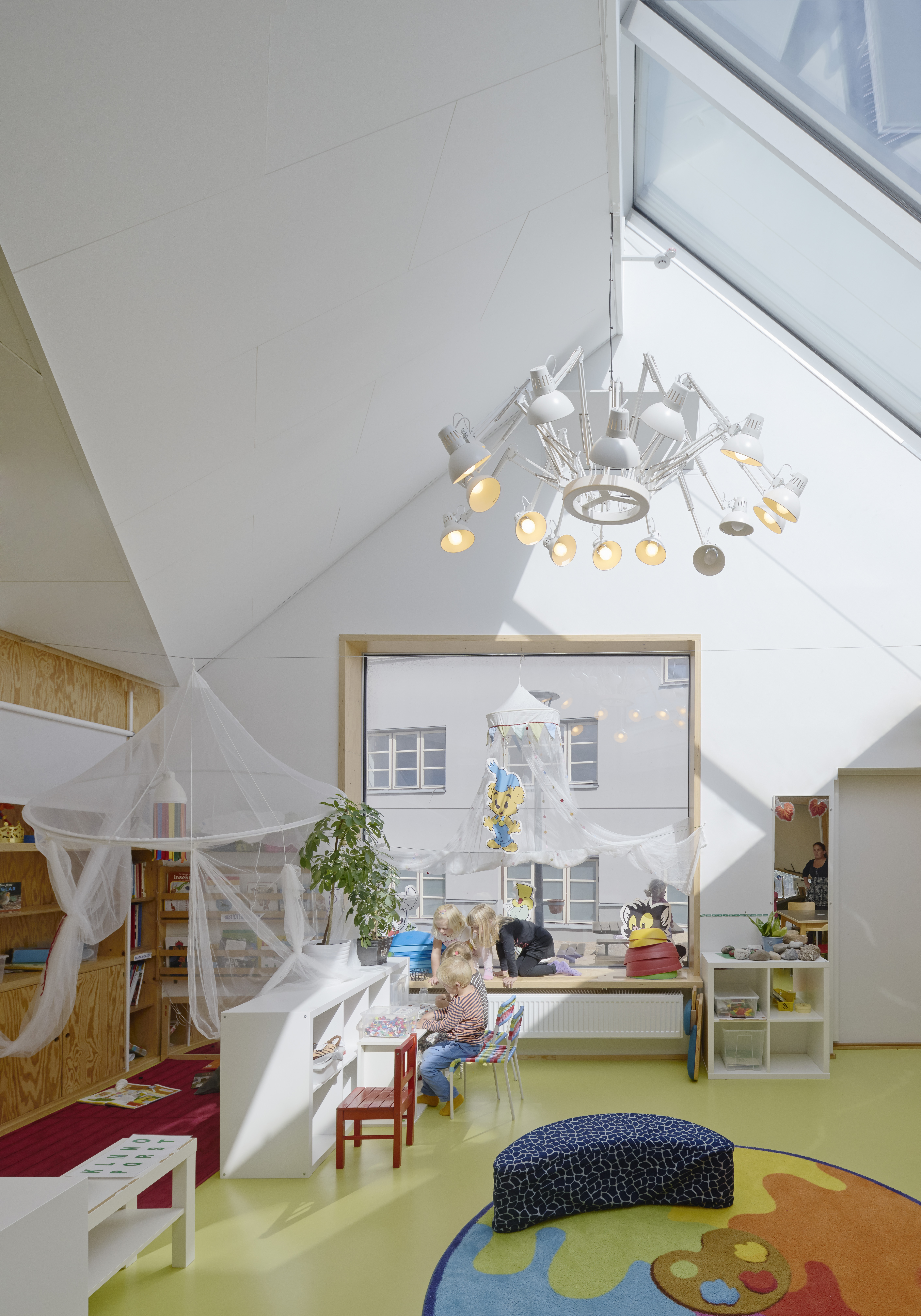 “Råå Preschool is a great example of high ambitions from the client and the architect, with regard to designing an inspiring environment and scale on the children’s terms, interpreting the conditions of the site and exploiting the possibilities of wood to create playful and innovative forms and expressions. The jury particularly values the high level of ambition applied to a municipal building for children. This is a category of building that isn’t always afforded the greatest care and ambition. The building’s volume shapes the interior rooms into new worlds to explore and provides views of the sea and land, while the outer form creates its own landscape and makes a very singular and congenial addition to the existing buildings in this fishing community. The clever use of materials and attention to detail offer a new way of protecting against the elements while creating a richly realised interior that meets functional needs and invites interaction and experiences. Råå Preschool makes a convincing statement about the importance of space for children and young people.”