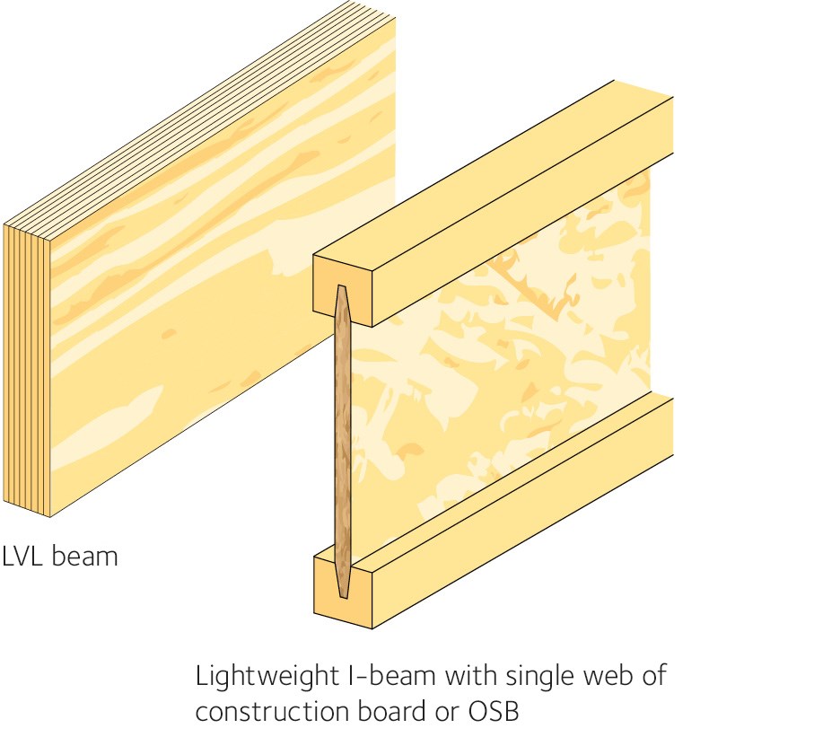 Wood-based lightweight beam systems comprise structural glued beams, studs, sill plates and various accessories. The products are industrially manufactured under controlled conditions. The basic idea behind them is that they save on materials and offer high strength. The cross-sectional shape of the components is an I-beam with flanges of construction timber and a web of 10 mm thick particleboard of type P5 or some other wood-based sheet material. The flanges can vary in size from normal to wide.