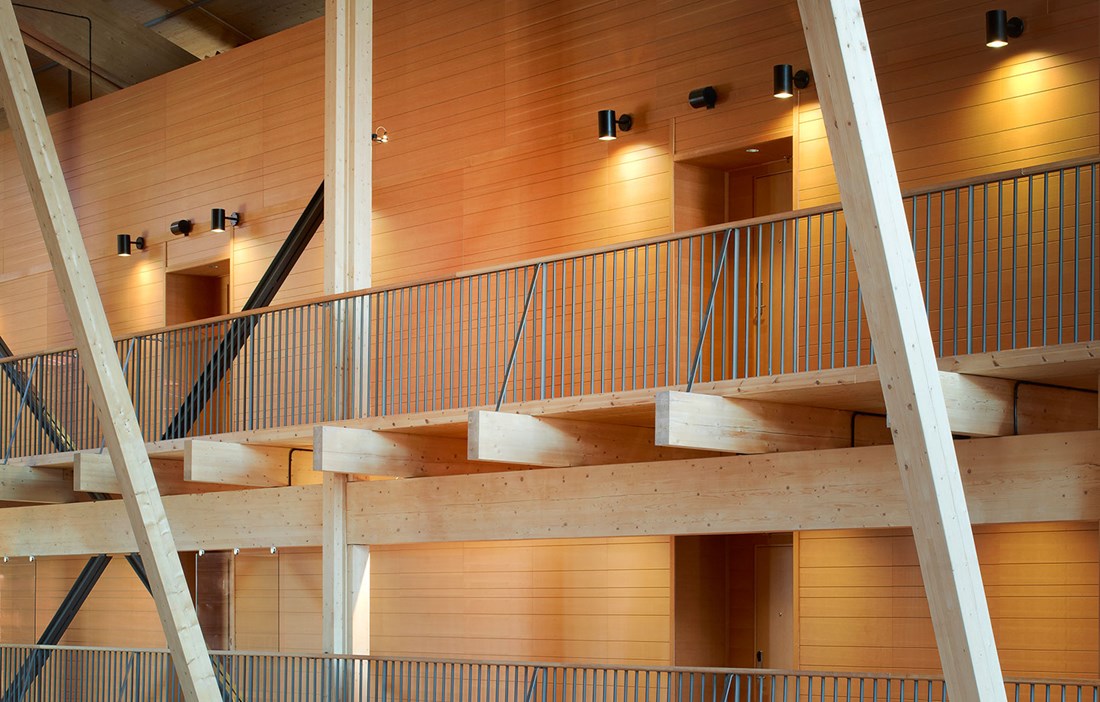 Glulam load-bearing frames are common in halls and public buildings, and have become increasingly widely used in high-rise apartment blocks. Bridges are another key area of use, while the use of glulam in low-rise buildings is also on the up.