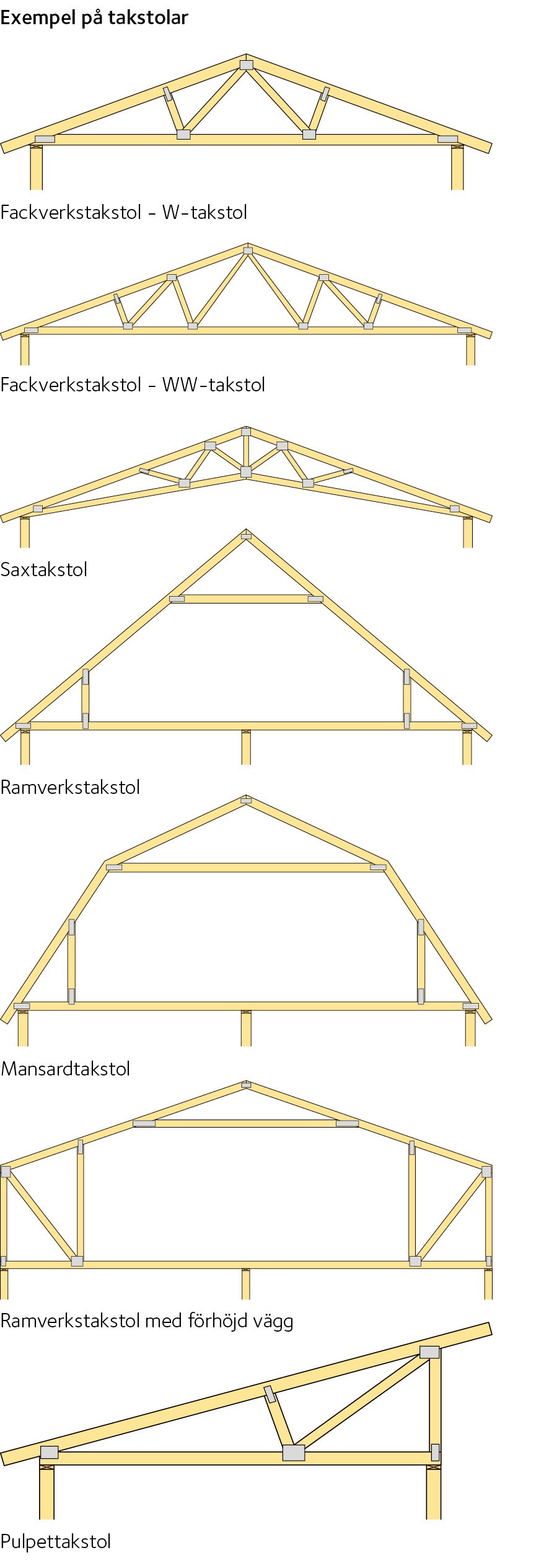 Roof trusses are usually manufactured industrially as finished products and must be CE-labelled according to the standard SS-EN 14250. The wood used is construction timber, usually 45 mm thick.