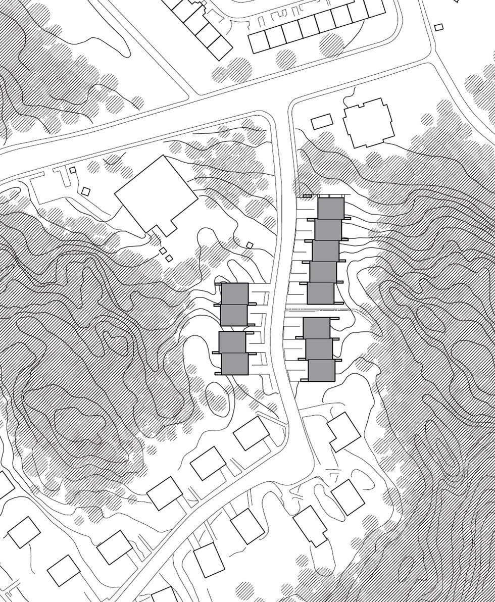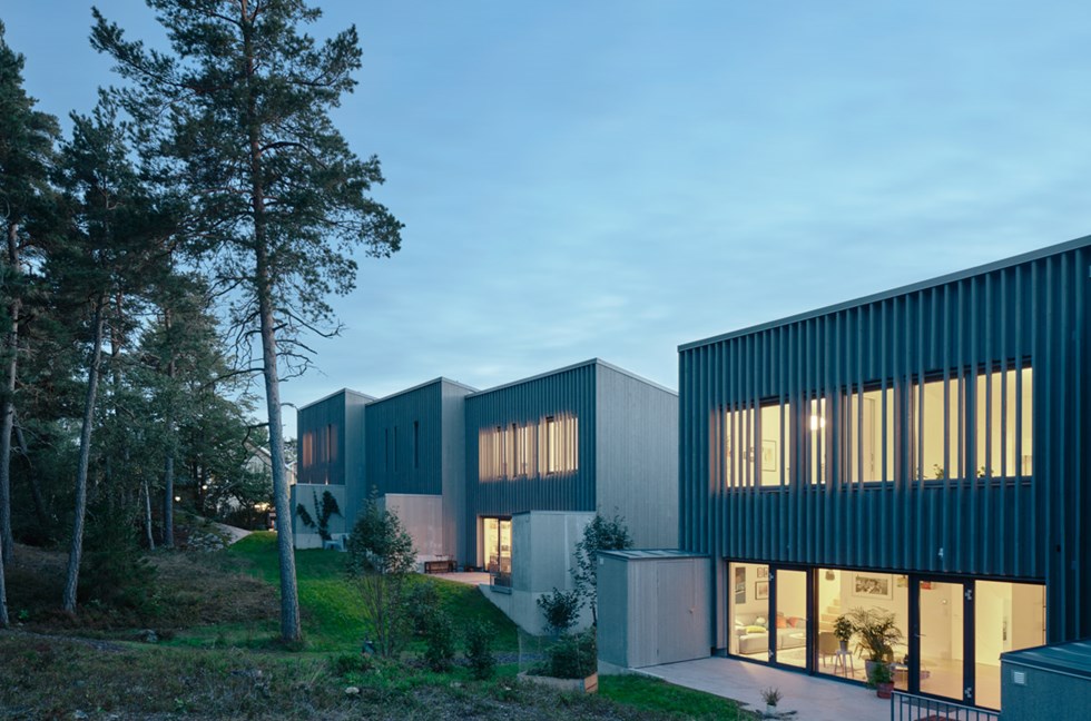A word from the architect Wood has been the main theme throughout the process. The 12 terraced houses started out as an initiative by the architects, before the building contractor was selected. Initially, the project was named Furuhusen (or pine house). The houses form a bridge between nature and the city. The twelve terraced houses stand in two rows along a street in Bagarmossen. The rear of the houses looks over the Nacka nature reserve, with its hills and pine forest. The floor plan, spread over four half-floors, has been designed to harmonise with nature and topography. The timber, not least the grid façade, appear both open and closed, evocative of walking among the pines while at the same time reinforcing the connection to the street as a social meeting place.